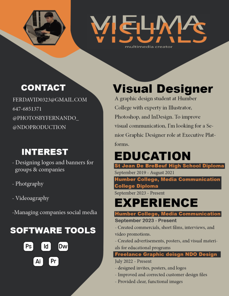 I’m Fernando, and I attend Humber College to study media communication. I’ve worked on numerous advertising and design projects that have strengthened my skills to produce eye-catching, clearly communicative images. I’ve also learned how to take photos and use them for advertising and creative work, thanks to my program. I am skilled in the design, editing, and production using industry technologies, including Adobe Photoshop, Illustrator, InDesign, and Premiere Pro. My primary loves are graphic design and photography, and I’m constantly trying to get better at both.